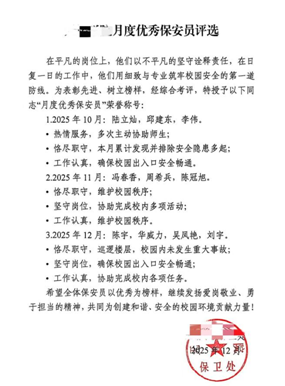 秩序标杆:严控出入口人车分流,确保校园交通“零拥堵”,获师生一致好评。