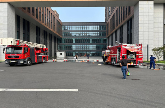 专业保障,流程贯通:院外消防救援车辆全程驻守提供专业支持;室内身着全套消防装备的人员有序铺设水带,模拟火灾区域救援行动,完整呈现“火情预警—快速处置—协同救援”闭环流程。