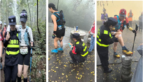 在隐龙谷君澜度假酒店起终点,队员们严格执行安检流程,运用专业设备对参赛物资、入场人员进行细致查验,确保无安全隐患流入赛场;赛道沿线,队员们顶着寒风细雨坚守岗位,疏导人流、维护秩序,指引选手路线,尤其在龙脊线、石屑岭等险要路段,用坚毅的身影为选手们筑起安全屏障,保障赛事按计划有序推进。