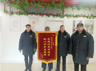 程女士康复后,对保安团队的及时救助和贴心服务深表感激,特意制作锦旗赠予王辰、王东和贾延龙,锦旗上写着“危难时刻伸援手,暖心守护显真情”,以表达对他们专业、负责和人性化服务的认可。