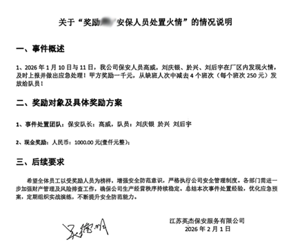 2026年1月10日至11日,英杰保安队长高威带领队员刘庆银、於兴、刘后宇在厂区日常巡查时,先后发现火情隐患。面对突发情况,四人沉着冷静、反应迅速,第一时间上报火情详情,随后严格按照公司应急处置流程,开展初期火情控制工作,有效遏制了火情蔓延,最大限度保护了厂区财产安全,保障了生产经营秩序平稳有序。